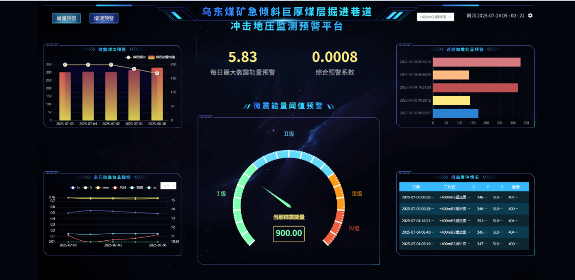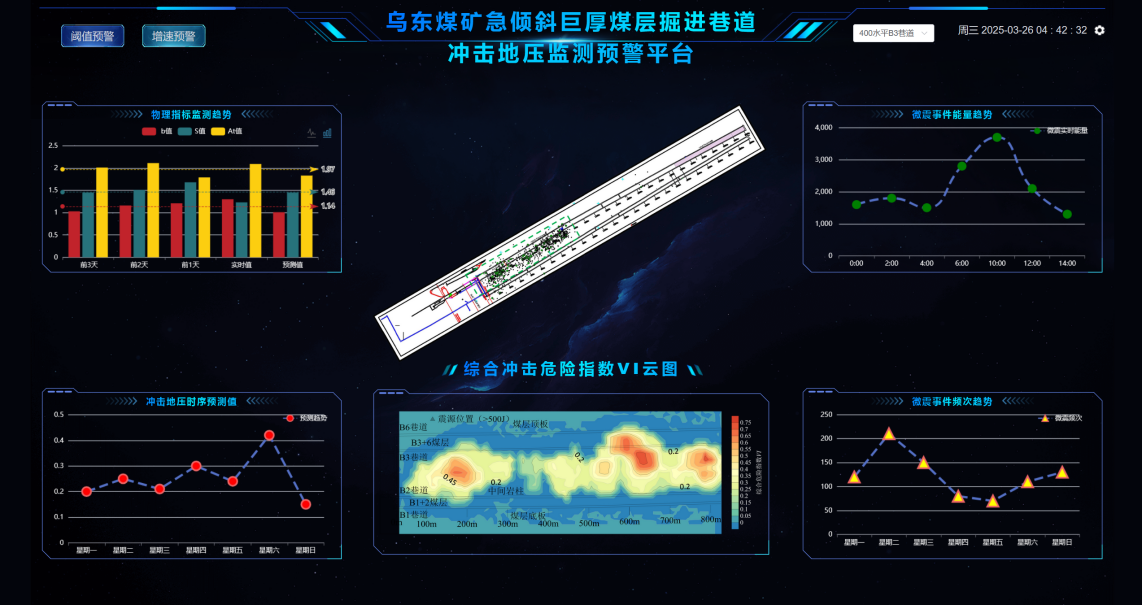 在平台层面推动工程化应用高质量落地。自主研发矿山动力灾害智能预警平台,实现多源数据实时接入与标准化处理,构建云端预警系统与可视化界面,支持阈值预警、趋势预警与增速预警。在乌东等煤矿工程验证中,预警准确率达到90%以上,成功预警2起大能量冲击事件,实现从“经验判断”向“数据驱动决策”的转变。