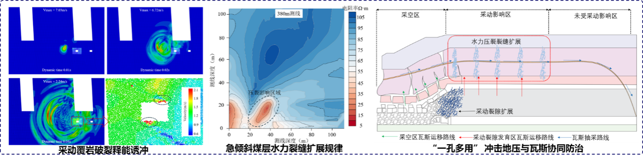 在陕西亭南煤矿、新疆乌东煤矿及准东二矿等应用,建立了基于采动加卸载响应比的动力灾害预警与调控方法及科学产能确定方法;针对煤矿因强矿压停产问题,团队提出的“结构探测+数据融合+支护优化”综合方案,成功实现下沟煤矿安全复产,为企业创造了显著经济与社会效益。科技创新,不再停留在论文之中,而是成为服务国家与人民的重要支撑。
