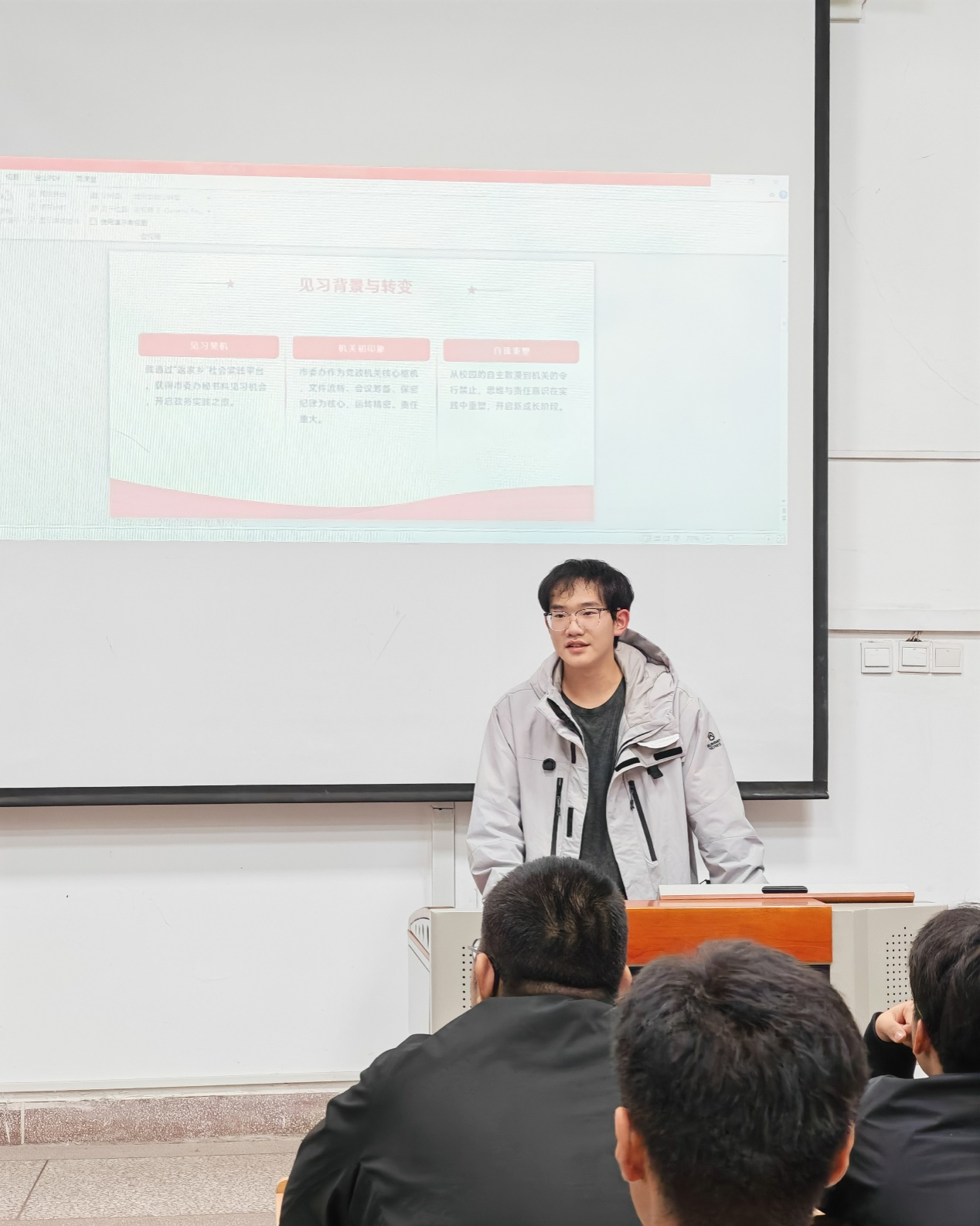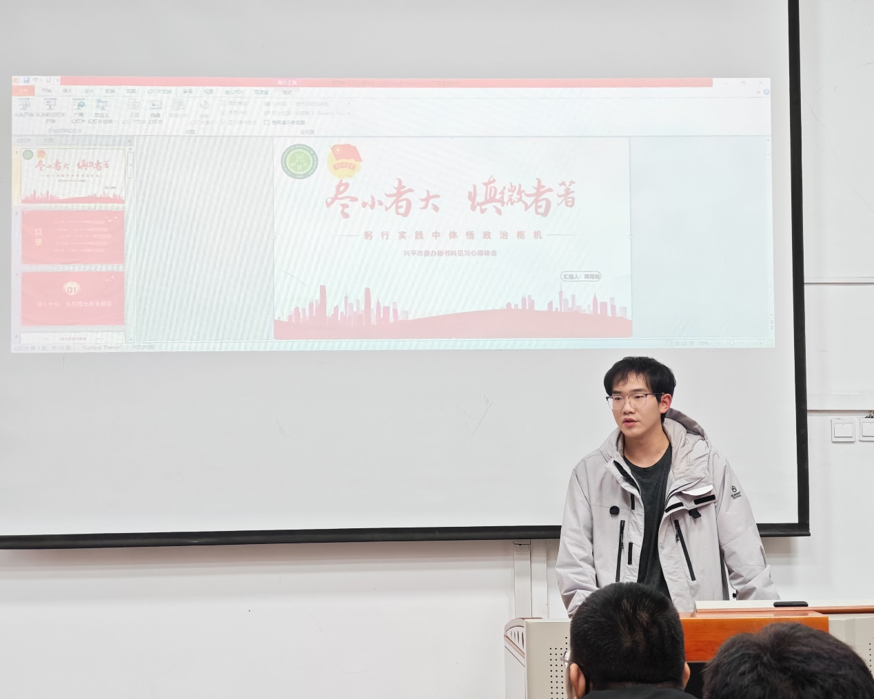 建环2302班的周雨森同学,以暑期在兴平市委办秘书科实习的经历为切入点,分享了大学生“返家乡”社会实践的收获和感悟。参与23场会议的会务安排、因一个标点符号重新打印200份材料、1小时内紧急通知传达至全市、深入社区开展志愿服务活动等,生动的案例不仅让他收获满满,也让在场的同学们体会到细节决定成败的深刻含义。